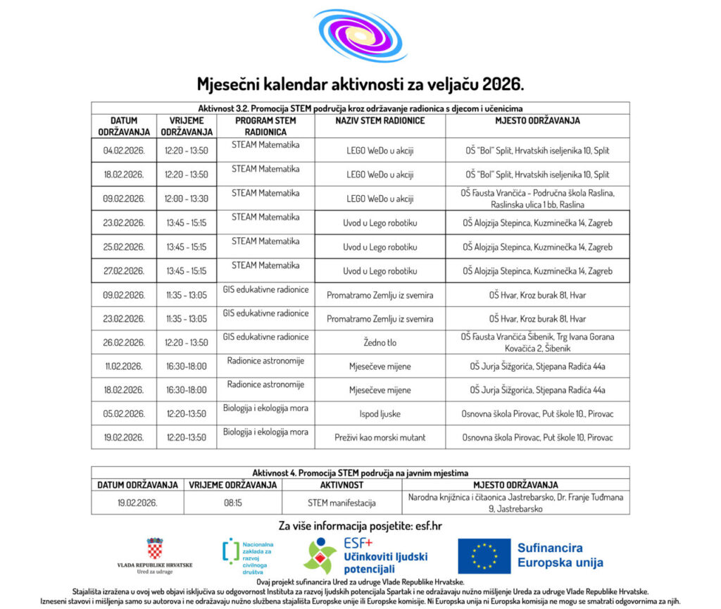 U prilogu možete pogledati Mjesečni kalendar aktivnosti za veljaču 2026. godine u sklopu ESF+ projekta „STEM Learning Network“ (SF.2.4.06.04.0081) ukupne vrijednosti od 297.557,55 eura, od čega bespovratna sredstva iznose 295.480,70 eura, a iznos EU sufinanciranja 251.158,59 eura. Provedba projekta će trajati u razdoblju od 20. ožujka 2025. do 20. ožujka 2027. godine. Prijavitelj je Institut za razvoj ljudskih potencijala Spartak. Partneri na projektu su: Krugovi, centar za edukaciju, savjetovanje i humanitarno djelovanje, Institut Ruđer Bošković, Sveučilište Algebra Bernays, Osnovna škola Hvar, Osnovna škola Pirovac, Osnovna škola Jakova Gotovca i Osnovna školaMladost.